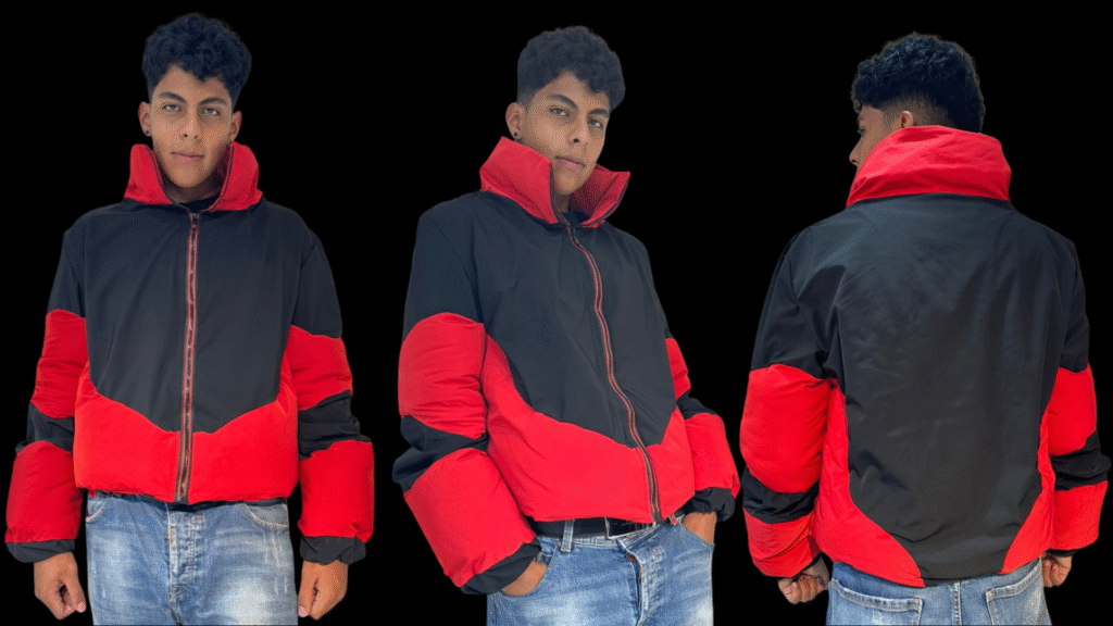 Las prendas combinan estructuras clásicas con materiales técnicos, siluetas acolchadas y contrastes de color que reflejan carácter, seguridad y sensibilidad. A través del equilibrio entre lo romántico y lo urbano, esta propuesta redefine la masculinidad moderna, exaltando la emoción, la autenticidad y el poder de vestir con intención.